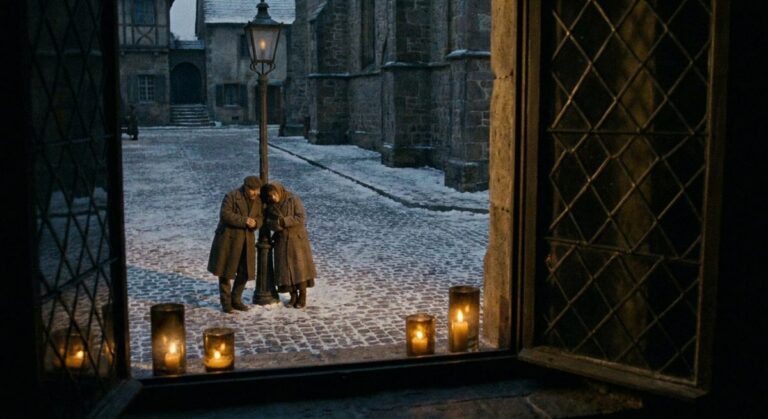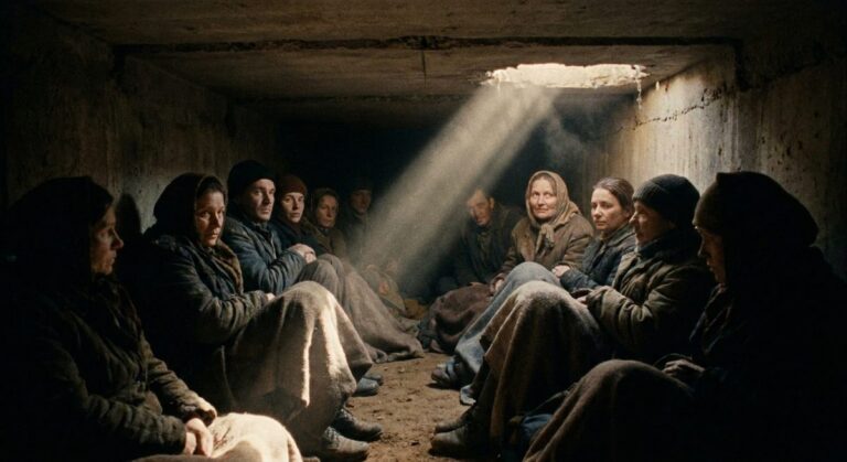 A group of refugees — families with children, elderly grandparents, wounded soldiers — make their way through a dark underground tunnel, fleeing the war that has destroyed their city above.…